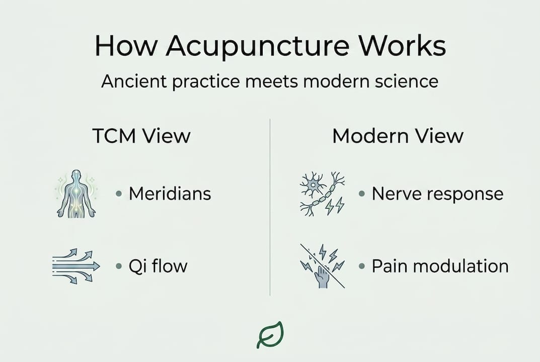 From the TCM viewpoint, your body contains a network of channels called meridians, through which a vital energy known as qi (pronounced "chee") flows. When that flow becomes blocked or imbalanced, pain and illness follow. Acupuncture needles are inserted at specific points along these meridians to restore harmony and balance. It's a poetic framework, and for millions of people, it maps onto their lived experience of how stress, tension, and pain interconnect in the body.