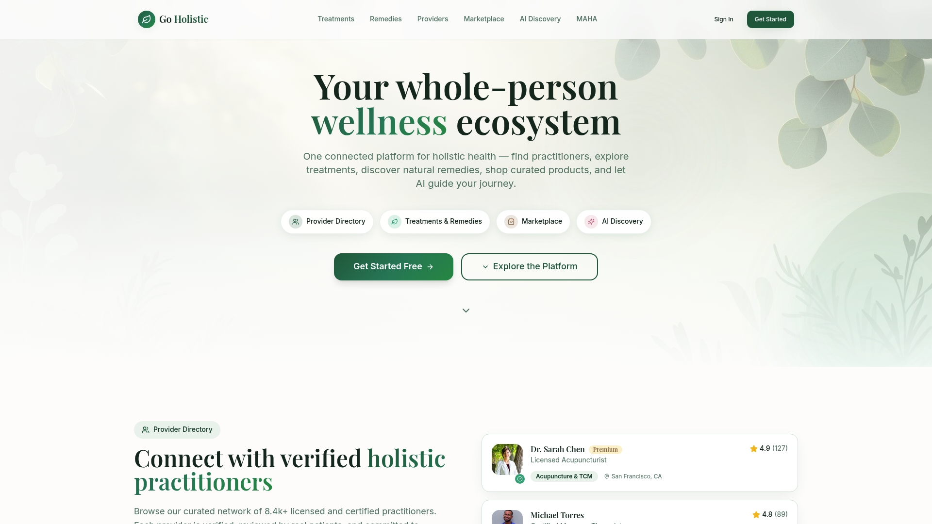 | Go Holistic | Verified practitioners directory, AI recommendations, curated marketplace, research resources | Comprehensive platform covering discovery and education; Verified practitioners; Evidence-based treatment recommendations; AI-powered personalization; Curated wellness marketplace | Focused on verified practitioners and evidence-based approaches | Free profile claiming; Practitioner subscription at $79.99/month |