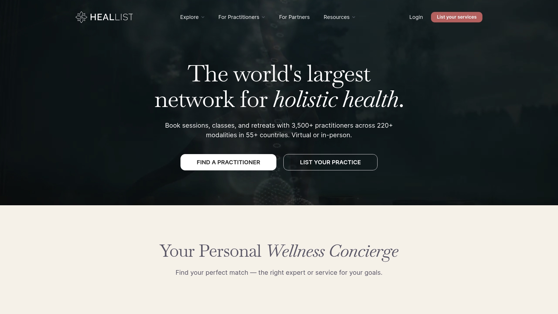 Heallist is a global holistic health marketplace that pairs users with practitioners across in-person and virtual formats, plus classes and retreats. The platform blends a broad directory with an AI-powered wellness concierge to guide personalized matches.