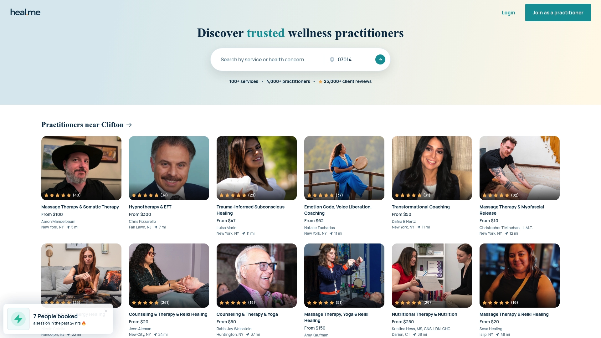 Heal.me offers search and book functionality, access to over 100 holistic services, client reviews, and virtual session options. The site also includes practitioner management tools that help therapists manage appointments and grow their practice.