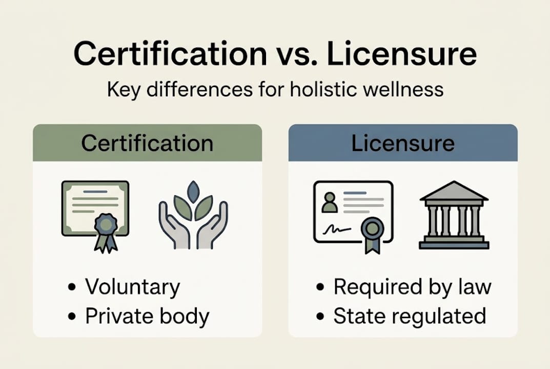 Credentials in holistic health fall into two broad categories: certification and licensure. They sound similar, but they work very differently and protect you in different ways.