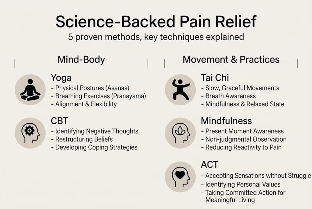 Evidence-based natural pain relief methods like CBT, acceptance and commitment therapy (ACT), yoga, tai chi, and mindfulness show real improvements in pain management and quality of life. Here's a quick snapshot of what these approaches target: