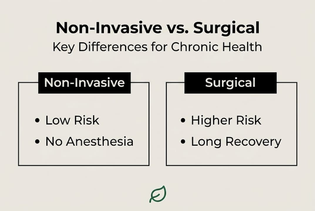 Before weighing your options, it helps to understand exactly what "non-invasive" means in a clinical context. Non-invasive treatments are those that work without any cuts, needles inserted into tissue, or tools placed inside the body. They enhance the body's natural healing capacity rather than bypassing it. That distinction matters, because it also shapes the risk profile: lower risk, minimal downtime, and a gentler learning curve for your body.