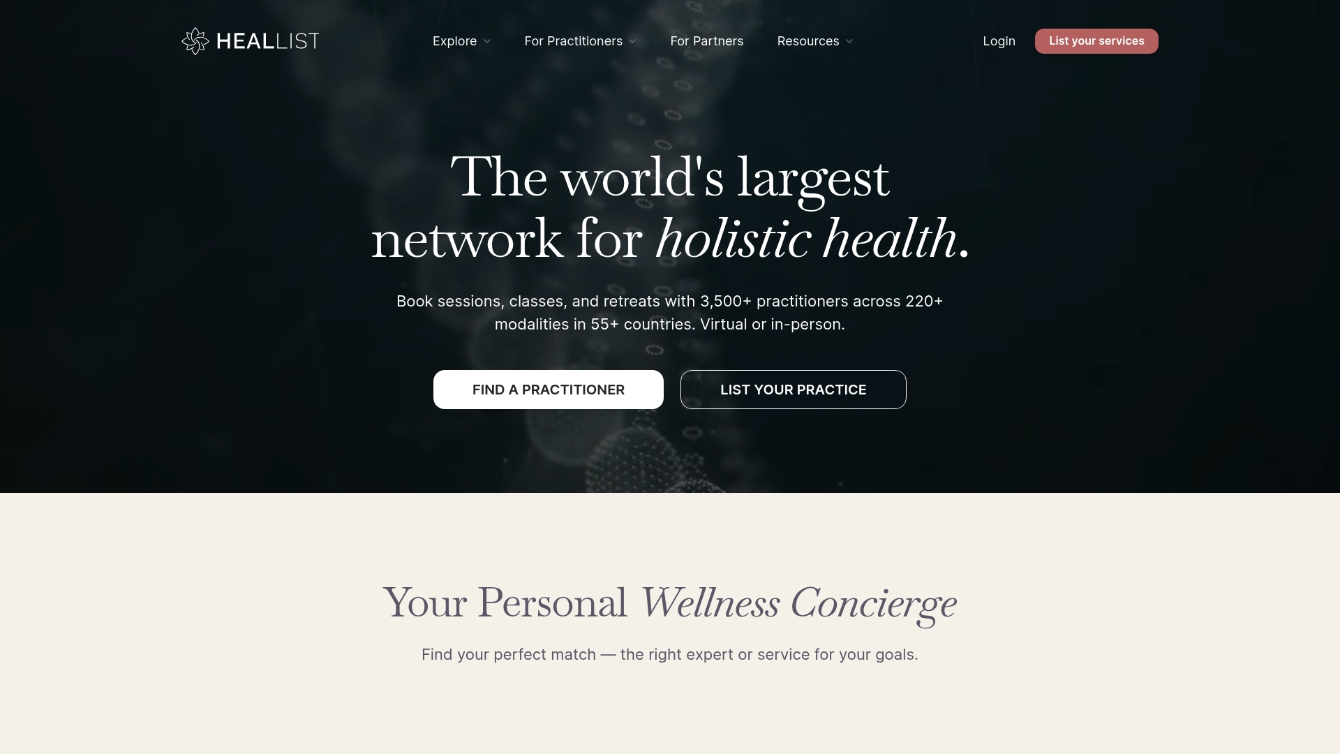 Heallist combines a global network of over 3,500 practitioners with an AI-powered Wellness Concierge that matches users to relevant modalities and services. The platform supports booking for virtual sessions, in person appointments, classes, and retreats and provides practice management tools for scheduling, payments, messaging, and video conferencing. Modalities include Ayurveda, Chinese Medicine, Naturopathy, massage, counseling, coaching, and movement practices.