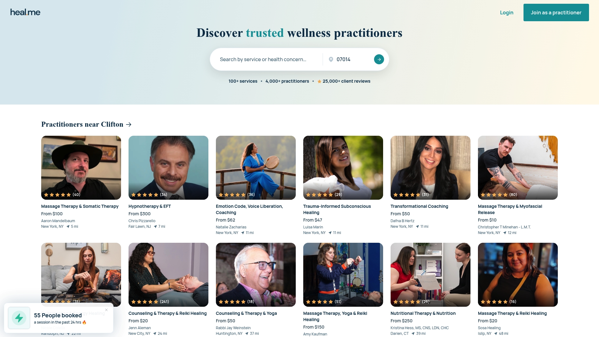 Heal.me lists over 4,000 holistic wellness practitioners and supports more than 100 therapies so you can search by specialty, location, or modality. The platform offers both virtual and in person sessions, detailed practitioner profiles with user reviews, and basic practice management tools for providers.
